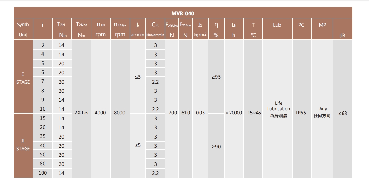 MVB-040-L1系列超精密背隙行星減速機系列(P0): MVB-040-L1系列精密背隙行星減速器系列(P1): MVB-040-L1系列標準背隙行星減速機系列(P2):