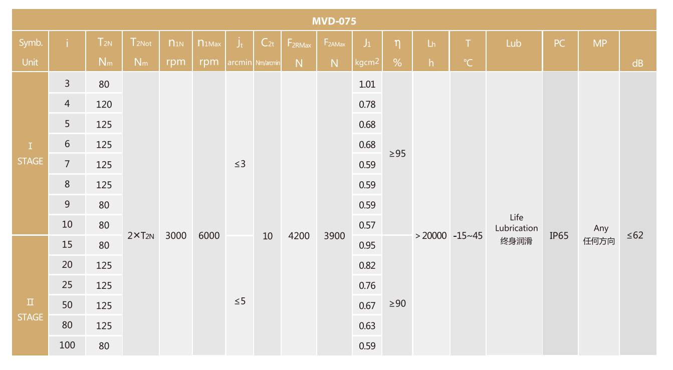 MVD-075-L2系列超精密背隙行星減速機系列(P0): MVD-075-L2系列精密背隙行星減速器系列(P1): MVD-075-L2系列標準背隙行星減速機系列(P2):