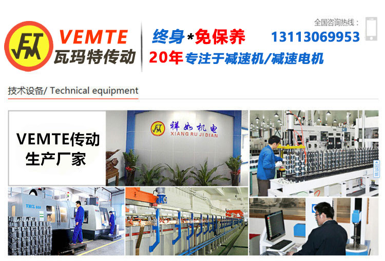 VEMTE(瓦瑪特)傳動 減速機(jī)/減速電機(jī) 生產(chǎn)廠家歸屬于廣東祥如機(jī)電設(shè)備有限公司,擁有自主品牌,兼?zhèn)涞聡姍C(jī)制造資深技術(shù)研發(fā)團(tuán)隊,優(yōu)質(zhì)金屬材料供應(yīng)商,先進(jìn)的技術(shù)設(shè)備和生產(chǎn)工廠。標(biāo)準(zhǔn)的生產(chǎn)工藝規(guī)范,嚴(yán)苛的質(zhì)檢流程,以及完善的售后體系。自2006年開始已經(jīng)服務(wù)了50000+客戶,深受客戶的好評與認(rèn)可。VEMTE(瓦瑪特)品牌主要產(chǎn)品:減速機(jī),減速電機(jī),剎車電機(jī)及變頻器等系列產(chǎn)品,主要服務(wù)于機(jī)械制造,節(jié)能環(huán)保,新能源等多領(lǐng)域,產(chǎn)品廣泛應(yīng)用于空氣壓縮機(jī),陶瓷,紡織,造紙,制藥,機(jī)床,建材,礦山,風(fēng)力發(fā)電,起重,船舶等行業(yè)。同時,廣東祥如機(jī)電設(shè)備有限公司致力打造節(jié)能環(huán)保的電機(jī),減速電機(jī)及工控自動化系列產(chǎn)品。