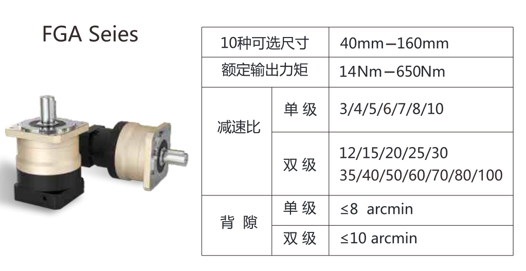 FGA系列行星減速機(jī)是我公司自主研發(fā)的新一代實(shí)用性產(chǎn)品,融合了國內(nèi)外先進(jìn)的技術(shù),具有以下一些主要特點(diǎn):低噪音:低于65db;低背隙單級可達(dá)1弧分內(nèi),雙級可達(dá)3弧分內(nèi);高效率:單段式在95%以上,雙段式在92%以上;高精密研磨的蝸線傘齒輪組可以達(dá)到400: 1的減速比。高扭矩低側(cè)隙的精簡結(jié)構(gòu)設(shè)計(jì)適用于精密伺服的應(yīng)用。免保養(yǎng)無需更換潤滑油,運(yùn)轉(zhuǎn)壽命長。