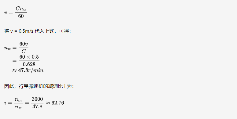 根據(jù)減速比和所需扭矩,我們選擇一款額定輸出扭矩為 800N·m,減速比為 60 的行星減速機。該減速機的輸入功率 P_in 為: