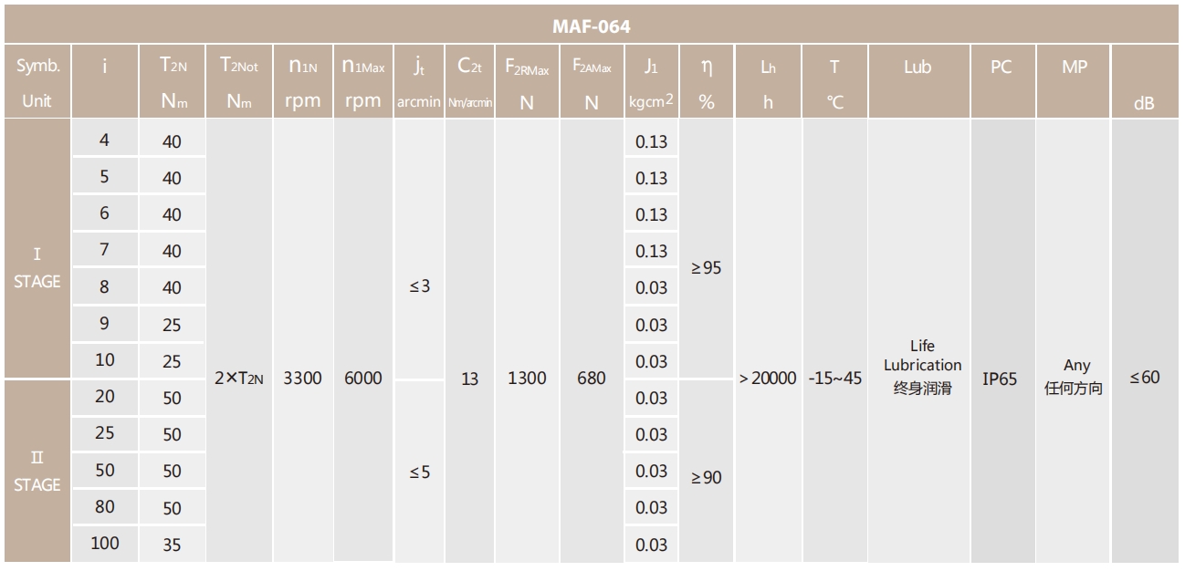 MAF-064-L2系列超精密背隙行星減速機系列(P0): MAF-064-L2系列精密背隙行星減速器系列(P1): MAF-064-L2系列標準背隙行星減速機系列(P2):